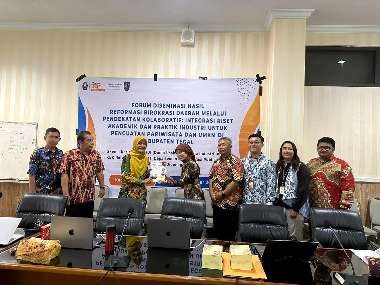 Tegal Regency, October 30, 2025 — The Faculty of Social and Political Sciences, Universitas Diponegoro (FISIP Undip), through the Bureaucratic Reform Academic Expertise Cluster of the Department of Public Administration, in collaboration with the Regional Development Planning, Research, and Development Agency (Bappeda Litbang) of Tegal Regency, held a Dissemination Forum on the Results of the Academia–Industry Collaboration (DUDI) under the theme “Regional Bureaucratic Reform through a Collaborative Approach: Integrating Academic Research and Industrial Practice for Strengthening Tourism and MSMEs in Tegal Regency.”